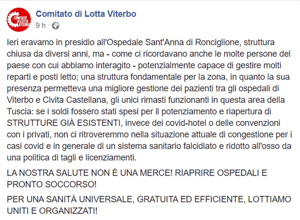 L’ennesima riprova di tutto ciò è quello che sta accadendo negli ospedali della nostra provincia: se l’ospedale di Montefiascone, cosí come quello di Ronciglione, fossero stati ristrutturati e rimodernati negli anni, se anche solo i loro Pronto Soccorso fossero stati mantenuti aperti e non chiusi, solo per una mera questione di numeri, come da tempi non sospetti affermiamo, sicuramente oggi l’ospedale Belcolle non sarebbe cosí congestionato ed in generale ci sarebbero stati più posti letto utilizzabili, invece di ricorrere ai Covid hotel… Stesso discorso vale per il potenziamento dell’ospedale di Civita Castellana e di ogni altra città della provincia.