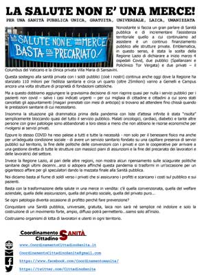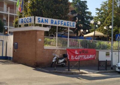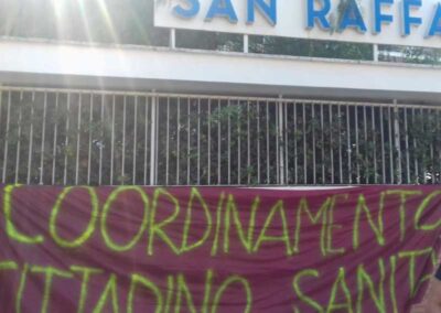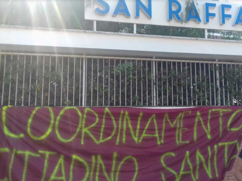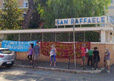 La presenza di questa mattina del Coordinamento davanti il San Raffaele era volta –attraverso un volantinaggio – a denunciare questa drammatica situazione chiedendo conforza la requisizione di tutte le strutture della sanità privata con la conseguente assunzionedel personale nel Servizio Sanitario Pubblico (anche per disarmare il ricatto occupazionalecostantemente usato dai pescecani della sanità) e la costruzione di una diffusa presenzadella sanità pubblica su tutti i territori.