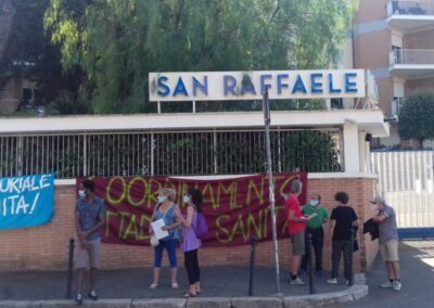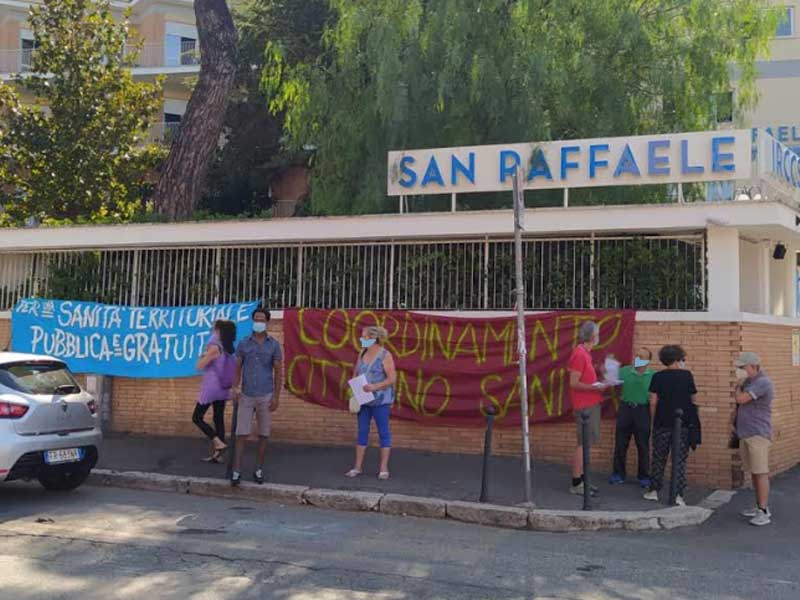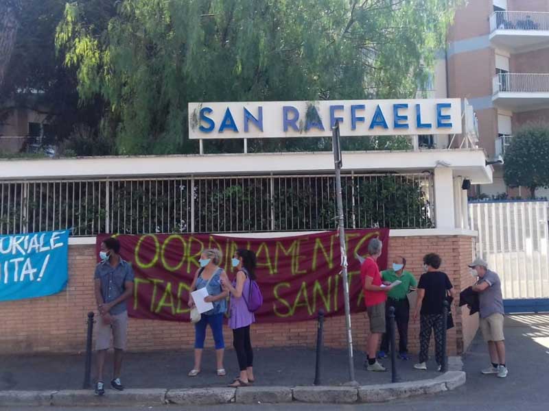 Oggi 24 luglio 2020 una delegazione del Coordinamento Cittadino Sanità si è recatadavanti l’IRCCS San Raffaele a via della Pisana, 235 a Roma. Istituto sanitario di proprietàdel sig. Angelucci – uno dei magnati della sanità privata nel Lazio e non solo – balzato allacronaca nel mese di giugno come nuovo focolaio di diffusione del contagio da Covid-19 aRoma (119 positivi e 6 morti secondo la Repubblica dello scorso 24 giugno) e per questoindagato dalla magistratura per l’ipotesi di reato di omicidio ed epidemia colposi (sempre laRepubblica del 24/6/2020).