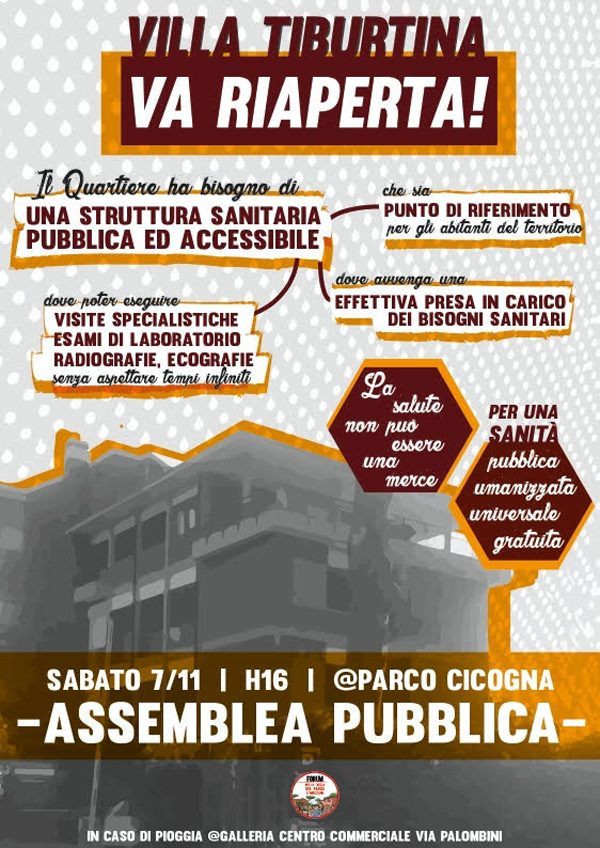 La riapertura di Villa Tiburtina, ambulatorio pubblico chiuso ormai da anni situato a via Casal de’ Pazzi 16, che costituiva un importante polo sanitario del territorio a pochi passi dalla fermata della metro Rebibbia.